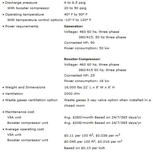 Discharge flow rate 2375 LPM, 5000 SCFH, 4545 kg/day, 10,000 lbs/day. Oxygen purity 92% +/-2%.