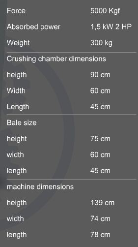 waste material easily. These presses allow you to reduce the size of different materials including paper, cardboard, plastics, polystyrene, foam rubber, P.E.T bottles, fabrics, leathers and similar materials. The volume of the pressed materials is notably reduced to form a small bale which simplifies transport and waste disposal.