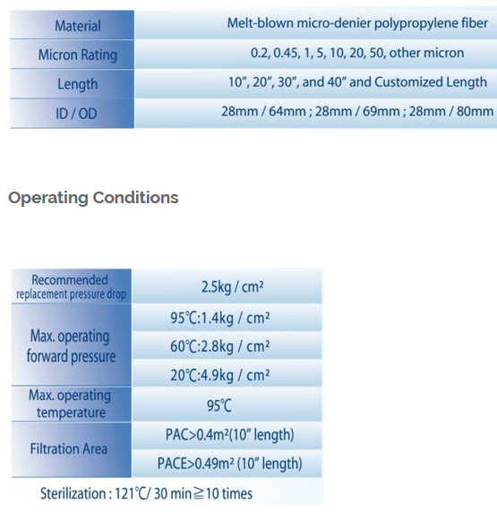 Double layers structure absolute efficiency filter (Absolute rating 99.9%). Low pressure drop, high holding capacity and long service life. 100% polypropylene for compatibility with a wide range of process fluids. Manufactured in sterile conditions, high clean cartridge.. End caps and connectors sealed by thermal bond, free of binder. Certificated by USP XXIII and FDA CFR Title 21. Pre-flushed with 18 Megohm-cm DI water, TOC content is lower than 40PPb.