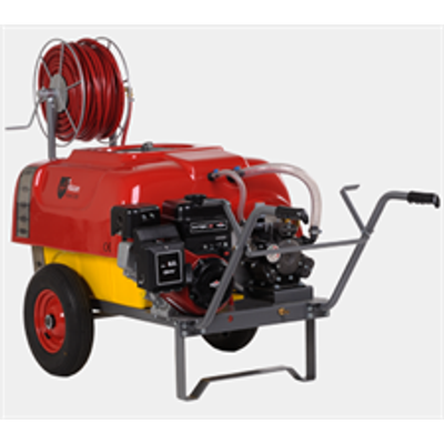 Wheelbarrow type sprayer with pulley driven system, 200 L fiberglass tank with external level indicator with graduated scale, total drainage tank, drainage tap, internal suction filter, agitation via return hose, 15m rubber hose Ø10 mm – 40 bar, 30 cm spray gun, 2 pneumatic wheels 4.00x8.