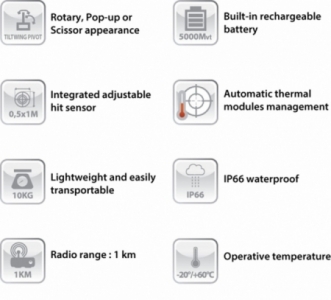Target-holder for the training and shooting practice with small arms. Designed for training over short distances (1000m), the PCI100 can be used both outdoors an indoors. It has three positions: Friend / Enemy / Hidden.
