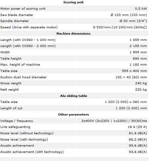 Motor power S6 40% 4,0 kW. Motor speeds 2 865/min.(3 438/min.[60Hz]). Max. saw blade diameter with scoring unit Ø 315 mm. Spindle diameter 30 mm (5/8` | 1`). Speed of main saw blade spindle 4 400/min.. Max. depth of cut with scoring unit 100 mm (70 mm [45°]). Saw blade tilting 0° ÷ 45°. Max. width of cut 800 mm (1 050; 1 500 mm)