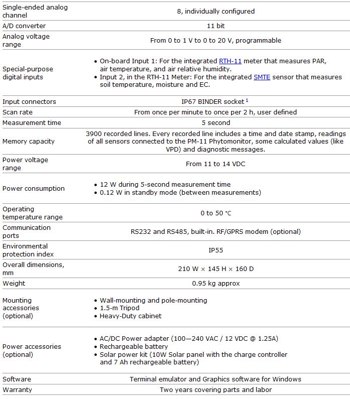The PM-11 Phytomonitor is a portable weatherproof data logger having a variety of optional sensors for plant and environment. Has accessories for easy and quick installation in laboratory, greenhouse or in the open.
