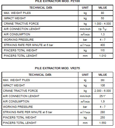 The pile extractor can be applied under the head of the pile driver machine, on forklifts and cranes. It is specially designed for piles guard-rail extraction, iron sheet piles and light profiles. The auxiliary of some self tightening clamps and some special levers enables a better gripping and release of the piles.