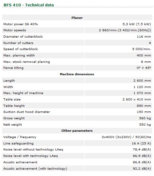 Four-knife cutterblock with 4 knives. Cutterblock protection. Adjustable surface table fence. Suction hood. Emergency stop. Braking motor. Overload protection. CE standards.
