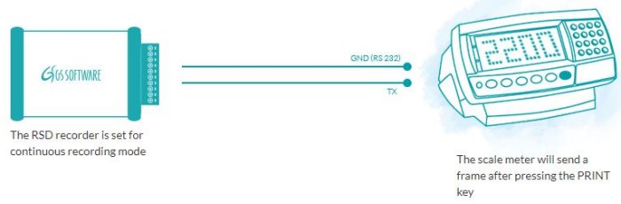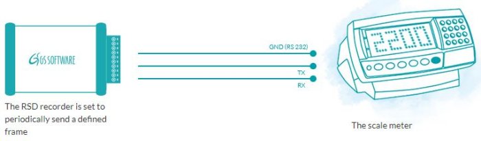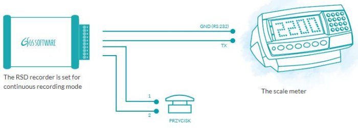 - a scale meter, connected to an external LED display, the RSD device connected to the RS232 transmission line (GND and Tx only). Recording of one frame takes place after pressing of an external button.