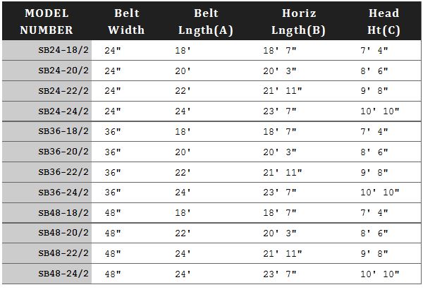 24`, 36`, 48` wide. Adjustable take-up at head assembly. Below-ground hopper = 60` long x belt width wide, includes pit apron. PVC belt with 2` cleats 18` OC (available smooth-top, rough top). 35ยบ incline. Choice of 18`, 20`, 22`, or 24` length (call for other lengths). 18` side wall. Electric drive, 2HP, single-speed 50-60 FPM (call for other speeds). ON/OFF controls including E-STOP opposite side . E-STOP. Shipped assembled for quick installation