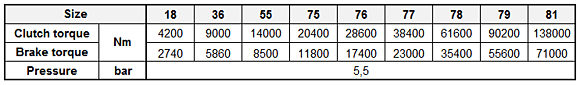 In addition to the double disc on the clutch side, this also has a double disc on the brake side. It therefore not only doubles the clutch torque, but also the braking torque. The outer covers and cores are made in thermowelded steel. The following table shows both the clutching and braking torques and the pressure of the different sizes of the series 5.6 clutch-brakes. More technical information is available by downloading the product`s datasheet.