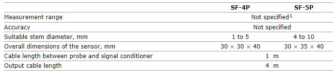 The SF-4P and SF-5P sensors are designed for monitoring relative variations of sap flow rate in a leaf petiole or small shoot. The sensor’s probe is made as a hollow collapsible heat-insulating cylinder. A heater and a pair of bead thermistors are located inside the cylinder. A signal conditioner provides powering of the heater and conditioning of the output signal. The probe is connected by a standard 1-meter cable to the waterproof box with the signal conditioner inside. Standard output cable length between signal conditioner and monitor is 4 meters.