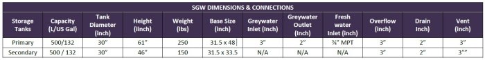 The SGW series system starts as a combined 500 litre (132 USG) Primary holding tank, fourBcartridge filtration system, controlled chlorination system and 2hp pump station built on a durable aluminum support assigned as the SGWB500. The versatile SGW series can be adapted by the addition of secondary 500 litre (132 USG) holding tanks also on durable aluminum supports that gives the SGW series increased greywater storage capacity.