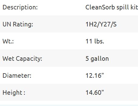 CleanSorb™ Spill Kit contains: one 5 gallon pail with cover UN rated (1H2/Y27/S), 4 socks (3 inch x 48 inch), 7 pads (15 inch x 19 inch), 1 disposal bag and wire tie, 1 warning label, 1 haz-mat response guidebook and spill kit instructions.