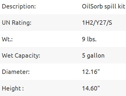 OilSorb™ Spill Kit contains: 1, 5 gallon pail with cover UN Rated (1H2/Y27/S), 4 socks (3 inch x 48 inch), 6 pads (15 inch x 19 inch), 1 disposal bag and wire tie, 1 warning label, 1 haz-mat response guidebook and spill kit instructions. OilSorb™ Spill Kits work with oils, fuels, lubricants and other hydrocarbon fluids. The 100% polypropylene sorbent soaks up to 16 times its weight. Incinerates completely. Economical refill kit (SKU RK5OS) lets you buy just what you need.