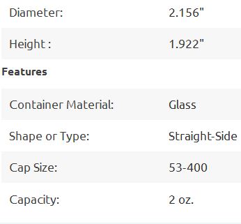 This 2 ounce straight sided glass jar has a wide mouth 53-400 neck finish and wide base. Bottle color is clear. This 2 ounce straight sided glass jar is ideal for a wide variety of applications. The bottle has a 2.156 inch Diameter x 1.922 inch High. The most popular cap for this jar is the white, 53-400 with F217 liner (SKU 53-400RMWF217), sold separately. The F217 liners have a low density polyethylene foam core between two solid layers of low density polyethylene. these liners have excellent chemical resistance and moisture tolerance. Other caps with different liners are available depending on your application. Contact a BASCO Customer Service Expert at 800.776.3786 for details.