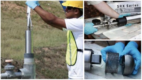 The SRX LP is installed to the desired drawdown level. It requires only three lines: air supply, air exhaust and fluid discharge. As liquid fills the pump, an internal float rises and opens the air inlet valve. As air enters the pump it closes the bottom inlet check valve and fluid is expelled from the pump. The float falls and as it nears it`s rest (or empty) position, closes the air inlet valve. Liquid can now enter the bottom inlet valve again. As the pump fills under the fluid’s own static pressure, air is vented through the exhaust port and the cycle is automatically repeated based on the well recharge rate.