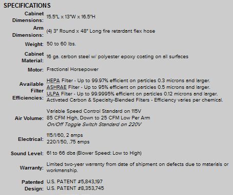 Typical applications for this unit may include soldering, powder and capsule filling, solvent and epoxy use, and a variety of applications involving chemical fumes and dusts. This unit is also a popular choice for technical schools (i.e. electronics laboratories) that require fume extraction for multiple students.