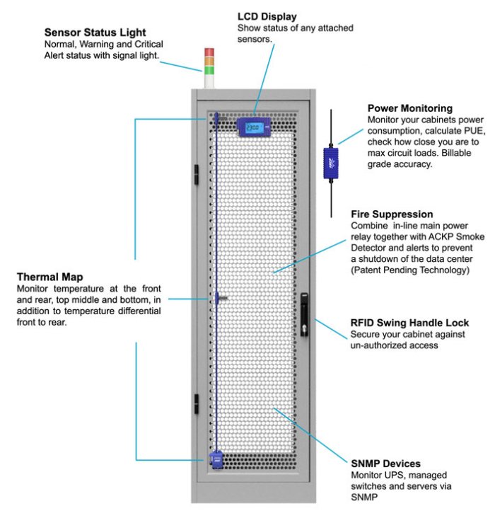 Use the Sensor Status Light as part of your intelligent computer cabinet solutions. With the AKCP Rack+ system the SSL is combined with power monitoring, cabinet thermal mapping, RFID swing handle access control and an LCD display. Build your system by selecting only the sensors you need to have a customer Rack+ solution.