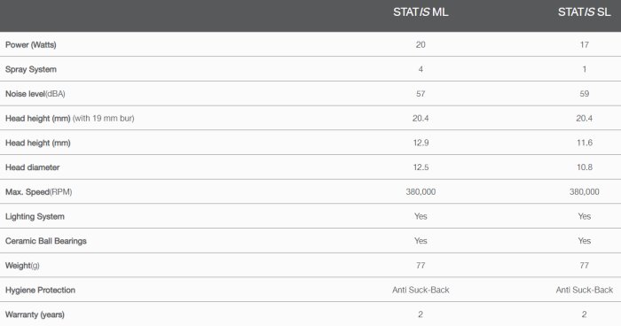 The German made STATIS handpieces offer superior reliability and optimal torque for fast, efficient cutting and are perfectly balanced for less hand fatigue.
