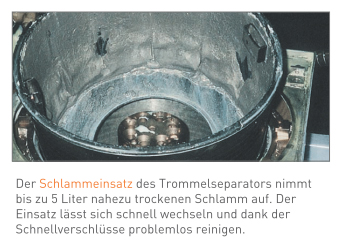 Specific Characteristics: Throughput 800 - 3000 l/h, Pre Filter 350 µm, Manual Disludging (without usage of tools), Capacity Sludge Container up to 5 liters, Two Phase Separating, Compact Design, Adjustable Flow Rate.