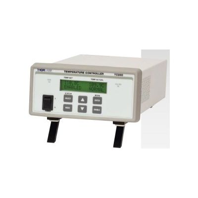 The TC200 Heater Controller is a benchtop controller intended for use with resistive heating elements rated up to 18 W. This general-purpose instrument can drive various types of heaters, including foil (HT10K) and resistive coil (HT15W) types. The unit accepts feedback from either positive (TH100PT) or negative (TH10K) temperature coefficient thermistors, has programmable P, I, and D gains, and will display the temperature in either °F, °C, or K. In addition, the TC200 can be programmed for up to five sequential temperature settings along with associated ramp and hold times for each level. A user programmable maximum temperature limit provides protection to the device being heated and a user-programmable power limit protects the heating element from being over driven. Other safety features include an Open Sensor Alarm that will shut down the driver if the temperature sensing element is missing or becomes disconnected.