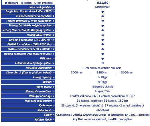TLL1280 offers a capable and flexible ‘bolt-on’ lifting solution that is flexible enough to cope with a wide range of containers from 140 litres.