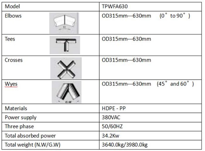 TPWFA630 fitting fabrication machine is designed to fabricate fittings like elbows, tees, crosses and wyes up to 630mm. With the help of jaws, it could make different fittings with various size. The TPWFA630 welding machine could weld plastic materials like HDPE, PP.