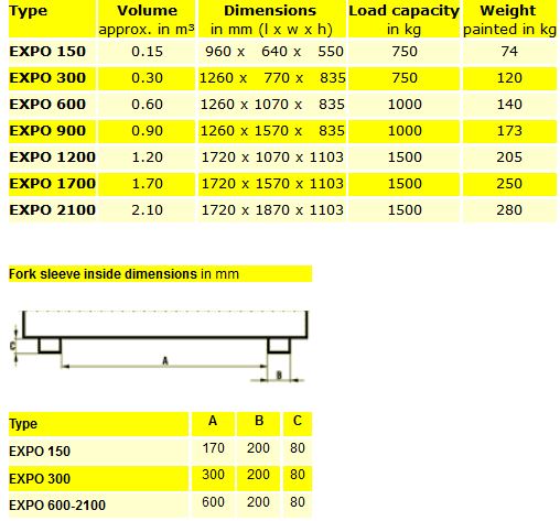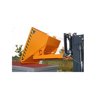 The compact one with rolling mechanism, ideally situated loading centre of gravity, can be emptied at any height by cable operated from the driver‘s seat, body wall with reinforced edging, sturdy frame with fork sleeves, can be secured to prevent slipping and unintentional emptying, wheels can be fi tted later.