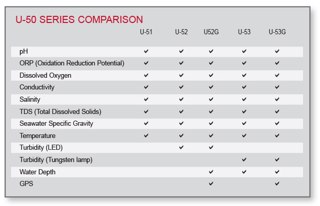 Simultaneously monitor, collect, and store up to 11 water quality parameters with these high-performance meters. Simultaneously monitor, collect, and store up to 11 water quality parameters with these high-performance meters. Measured parameters include pH, ORP, dissolved oxygen, salinity, TDS, seawater specific gravity, temperature, turbidity, and water depth. The waterproof control unit is designed to be both rugged and easy to operate, making it a perfect match for fieldwork - ideal for sampling rivers, groundwater, wells, lakes, runoff / drainage, and a myriad of other ecological and agricultural applications. Refer to the chart below to help decide which model best fits your needs.