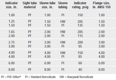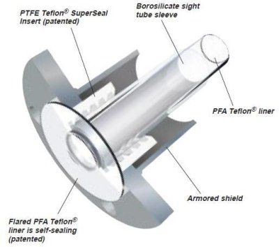 Approved by the Factory Mutual System. Available in any length up to 72 inches. Stock lengths are 8 and 12 inches. Unobstructed visibility. Patented one-piece SuperSeal inserts are self-sealing. Wetted part is one-piece PFA Teflon, flared over SuperSeal insert. Available with sanitary fittings. Threaded end connections are available. Design is double sealed. Excellent for corrosive, viscous, or sanitary service. Sight tube sleeve can be calibrated directly. Custom designs available; consult factory. Optional 304 or 316 SS construction. ANSI Class 300 lb flanges available.