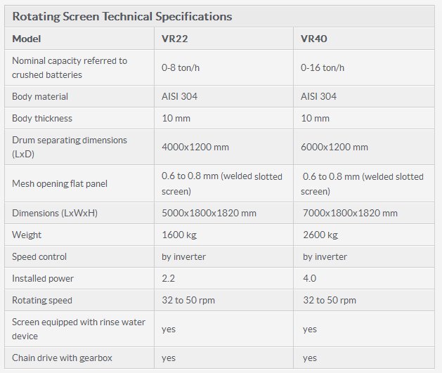 The screen for the lead battery recycling plant consists of a rotating drum, fixed on a supported frame, with four wheels which allow the rotation of the drum around its own shaft. The material to be sieved enters one end of the rotating drum; the product moves on thanks to the rotating effect of an internal screw fixed at the drum. During the passing through the drum the material is continuously stirred in order to enable the separation of the paste from the grids and the plastics of the batteries. This operation is supported by water jets released from the nozzles of two tubes inserted into the rotating drum.