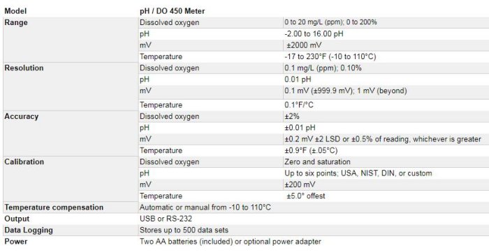 Reduce maintenance and costs with affordable optical RDO technology. Waterproof and dustproof with IP67 rating. Large Backlit display. Automatic Temperature Compensation. °C/°F selectable. Easy-to-service, low maintenance DO probe. Store up to 500 data sets; easy USB or RD-232 output with optional data cables. Offset adjustment capabilities. pH features: Push-button pH calibration at five points with automatic buffer recognition.