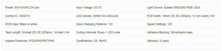 - WS2815 Individually addressable RGB LEDs (30, 60, or 144 LEDs per meter).