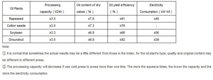 Below features are based on oil plants with above average quality smoothly and continuously squeezed after good pretreatments, such as screening, husking, flaking and cooking, etc.