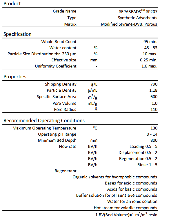 SEPABEADS SP207 is modified highly porous synthetic adsorbents. It has higher hydrophobicity and greater selectivity for non-polar molecules, which is derived from chemically bonded bromine to the aromatic rings, than standard aromatic adsorbents. It is suitable for upward flow and batch processes due to its high particle density.