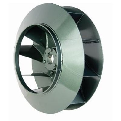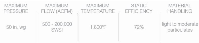 Wheels utilize heavy gauge, curved, radial tip blades. Wheel perfoms to high efficiencies at relatively low tip speeds maintaining smooth quiet operation. Easily made of special alloys. Suitable for wear liners. Standard catalog sizes from 5 (8.75” Dia.) to 66 (114.75” Dia.) with custom sizes available.