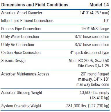 The MODEL 14 is designed with a unique internal cone under-drain that provides for the efficient collection of treated water and the distribution of backwash water. Also, the internal cone ensures efficient and complete discharge of spent carbon from the adsorber without the need to open the manway to manually wash out the residual spent carbon.