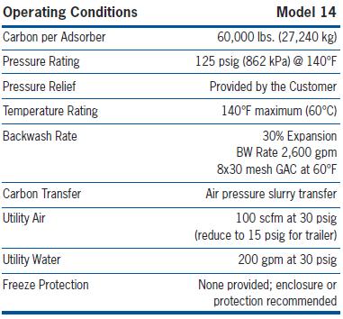 The Calgon Carbon MODEL 14 is an adsorption vessel designed for the removal of dissolved organic contaminants, including disinfection byproducts (DBP) or natural organic matter (NOM) from liquids using granular activated carbon (GAC). The vessel is sized to hold 60,000 pounds of GAC which provides the additional contact time required to remove either compounds at low concentrations or poorly adsorbing compounds. The standard design is a single vessel concept where a number of MODEL 14 vessels are configured for parallel operation. As an option, two vessels can be combined with a centralized pipe manifold to allow for series operation. This flexibility of configurations allows the engineer to select the alternative that best meets the requirements of the site and treatment objectives.