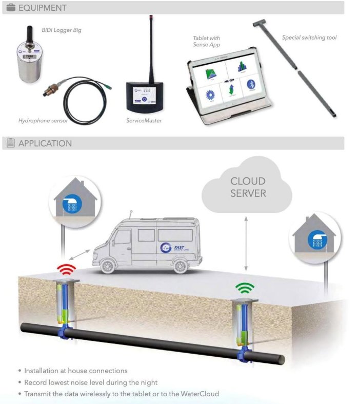 2-in-1-SOLUTION: House connection with integrated data logger. Easy set-up with tablet and servicemaster. Free sense app with automatic updates. Can be equipped with different sensors: acoustic / pressure / temperature.