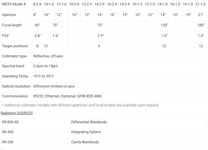 The METS, based on CI’s reflective optics for wide spectral coverage, extended area blackbody and a motorized target wheel, provides fast and reliable testing for repeatable and objective results. The METS can be easily modified for a range of applications, including automated FLIR, CCD, Laser and boresight testing on the production floor, lab or depot when used in conjunction with CI’s automatic test software. The METS are designed to retain their accuracy over a wide range of temperatures.