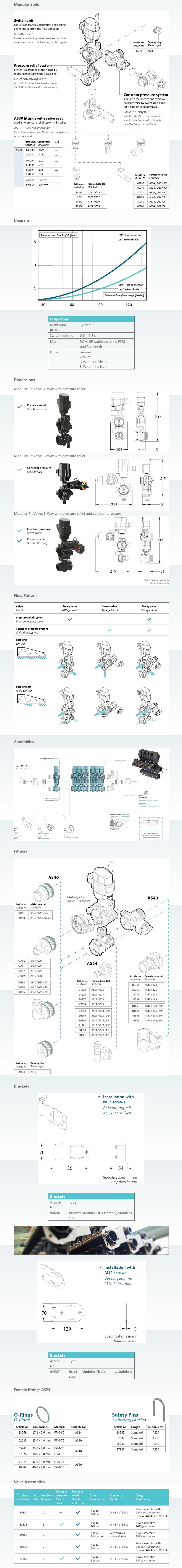 Properties: Maximum pressure: 12 bar. Switching time: 0,6 .. 0,8 s. Material: POM GF, stainless steel, FPM- und NBR-seals. Drive: manual, 2-Wire, 3-Wire (+) driven, 3-Wire (–) driven.