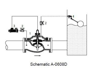 The Singer model 106-F-Type 4 modulating float valves are based on the 106-PG main valve. They are ideal for balancing the inflow and outflow demand into the storage tank and maintaining level at the designated maximum. The valve closes drip-tight at the maximum level and modulates to maintain the tank level. The float pilot is remotely installed at the high level in the storage tank. Pilot connections to the main valve are connected in the field. As the tank level drops the main valve is opened proportionally to increase the filling rate. Movement of the main stem alters the size of the closing restriction, interrupting the tendency of the valve to hunt.