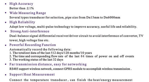This flowmeter can be virtually applied to a wide range of measurement. A variety of liquid applications can be accommodated: ultra-pure liquids, potable water, chemicals, raw sewage, reclaimed water, cooling water, river water, plant effluent, etc. This   ultrasonic module is inline measurement for long-term.The convenor and transducer arc installed fixing on the pipe, with the advantages of small size, low cost and easy operation.