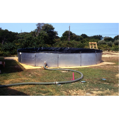 Modular 4’ high flat wall panels are 20 ga. mill galvanized steel. Reinforcing straps are 11 ga. mill galvanized steel. Steel rod anchors and a plastic liner are included. Capacities range from 2,200 to 31,700 gallons.