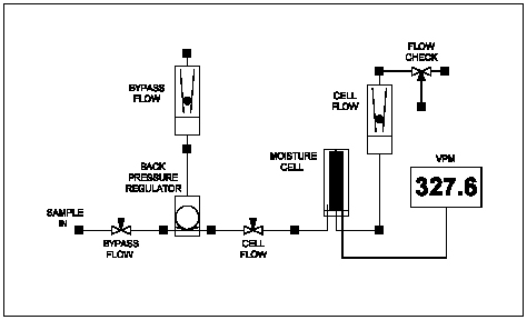 The operating principle of the moisture analyser is as follows. Sample is passed through a phosphorous pentoxide (P2O5) electrolytic cell of proven performance at a constant flow. All of the moisture in the sample is continuously absorbed on to the P2O5 and electrolysed by passing a current through the platinum wires. According to Faraday`s Law, the moisture content of the gas is proportional to the amount of current required for electrolysis.