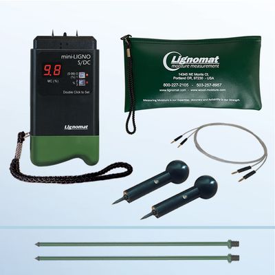 The mini-Ligno S/DC moisture meter measures hardwoods, softwoods, panel products and drywall, exterior and interior wall boards with percent scales and concrete and other building materials with a reference scale (with E16) .