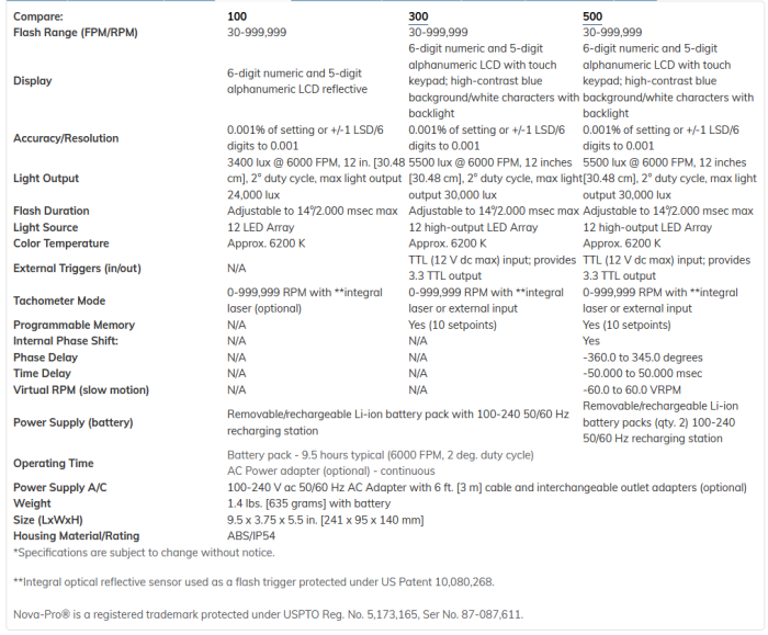 Our Nova-Pro 500 is designed for simple stroboscopic stop motion inspection and RPM measurement applications. The included integral laser module is a patented unit that can be added to make the Nova-Pro 500 a full-featured tachometer. NIST Traceable Certificate included.
