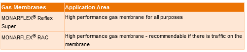 We recommend the use of MONARFLEX® Reflex Super and MONARFLEX® RAC for protection of houses against gas penetration. Both membranes are high performance membranes with unique tensile strength and puncture resistance properties.