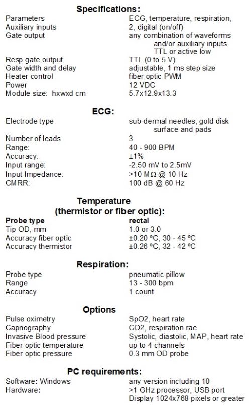 The animal`s electrocardiograph (ECG) waveform is measured using three leads with sub-dermal needle electrodes, gold disk surface electrodes or radio translucent pads. The waveform is processed to detect R-waves and determine the heart rate. Temperature is measured using a small rectal temperature probe. The 1025T can be factory configured with either a thermistor or a fiber optic temperature sensor. The temperature measurement can be used in conjunction with a Heater System to regulate the temperature of the animal. Both air and fluid heater systems are available. Temperature variations of ±0.2 °C can typically be obtained. A respiration waveform is measured using a small pneumatic pillow placed next to the animal`s abdomen. The waveform is automatically processed to detect inspiration, expiration and respiration rate. Optional modules can be used with the 1025T to provide pulse oximetry, capnography, invasive blood pressure, fiber optic temperature, minimally invasive pressure. Auxiliary TTL input channels allow the user to gate from user generated pulses. Optionally, auxiliary analogue input channels allow the user to acquire, record, display and gate from user generated waveforms. A sophisticated user configured gating algorithm allows gates generated from each measured waveform to be combined to supply a trigger to the imager. The user can control the start, stop and width of each gate. Power is supplied from an external 12 VDC power supply which operates from 100-230 VAC, 50-60 Hz.