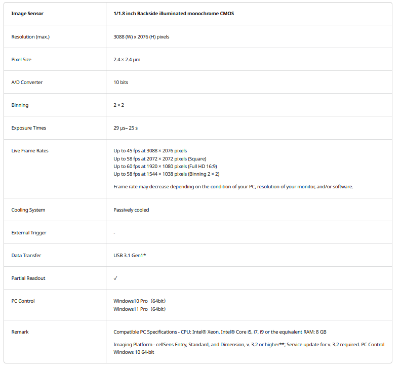 - See subtle and small details: the backside illuminated monochrome CMOS sensor with 2 × 2 binning and Olympus Smart Image Averaging produce high signal-to-noise ratio images
