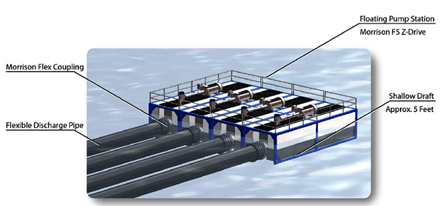 The Morrison "Floating Solution" Pump Station is engineered and manufactured by Morrison Pump Company. It`s unique design provides high capacity pumping under low submergence applications, allows for stability even during full operation, while maintaining portability due to its ease of installation and compact design.