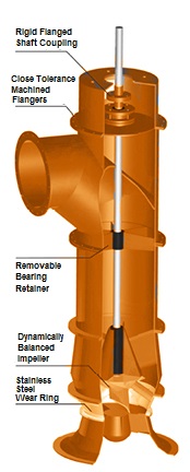 Morrison Mixed Flow Pumps include all standard features of our lineshaft pumps including jointed (segmented) pump construction, dynamic balancing of impellers, stainless steel rotating elements and wear rings, electrical isolation of dissimilar metals, removable bearing retainers, and standard marine nitrile rubber radial bearings. Furthermore, all Morrison Mixed Flow Pumps are provided with certified pump performance curves. Morrison High-Efficiency Mixed Flow Lineshaft Pumps can be in vertical, horizontal, or slant (angle) configurations, and may be oil, water, or product lubricated (no seals, no oil).